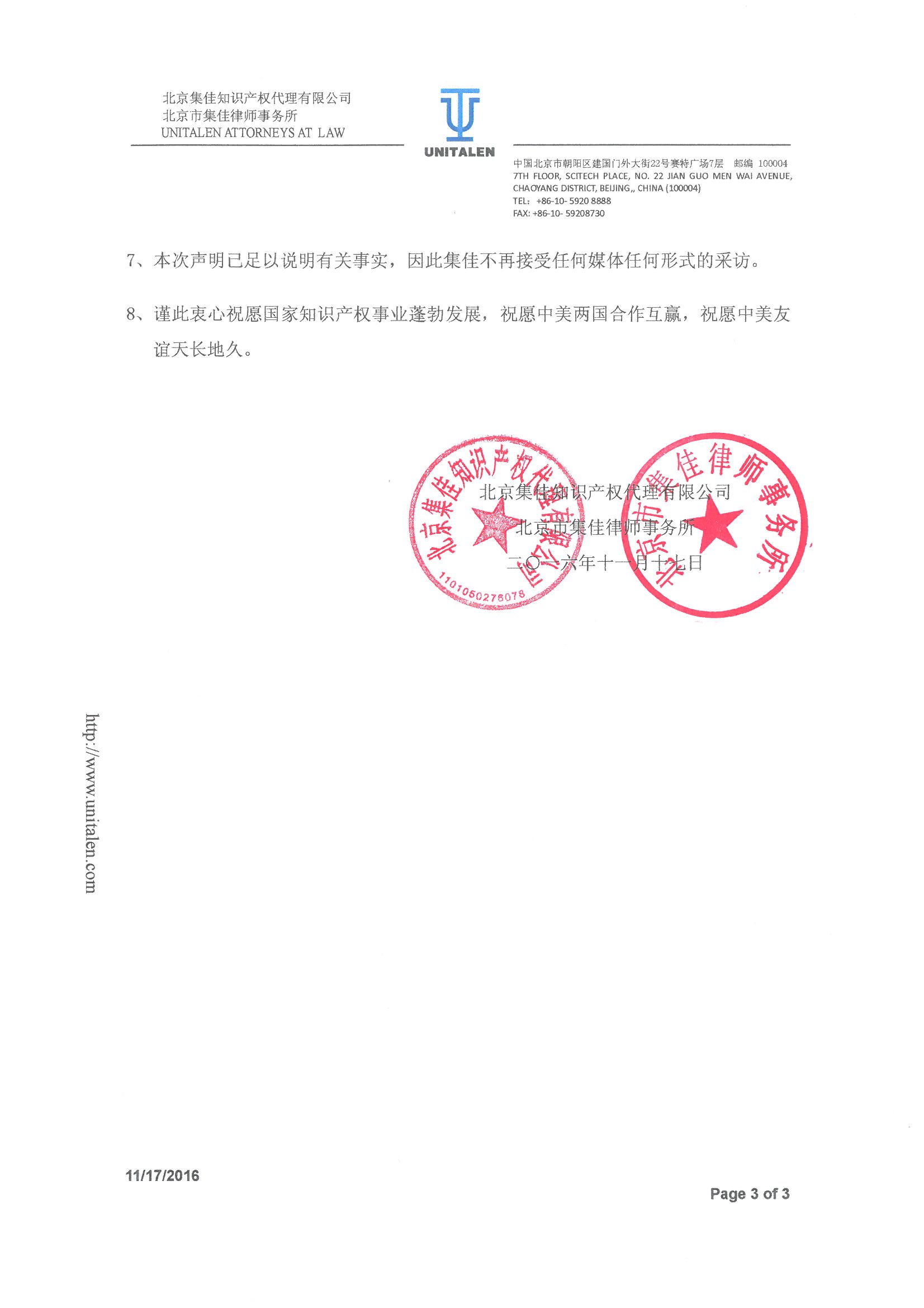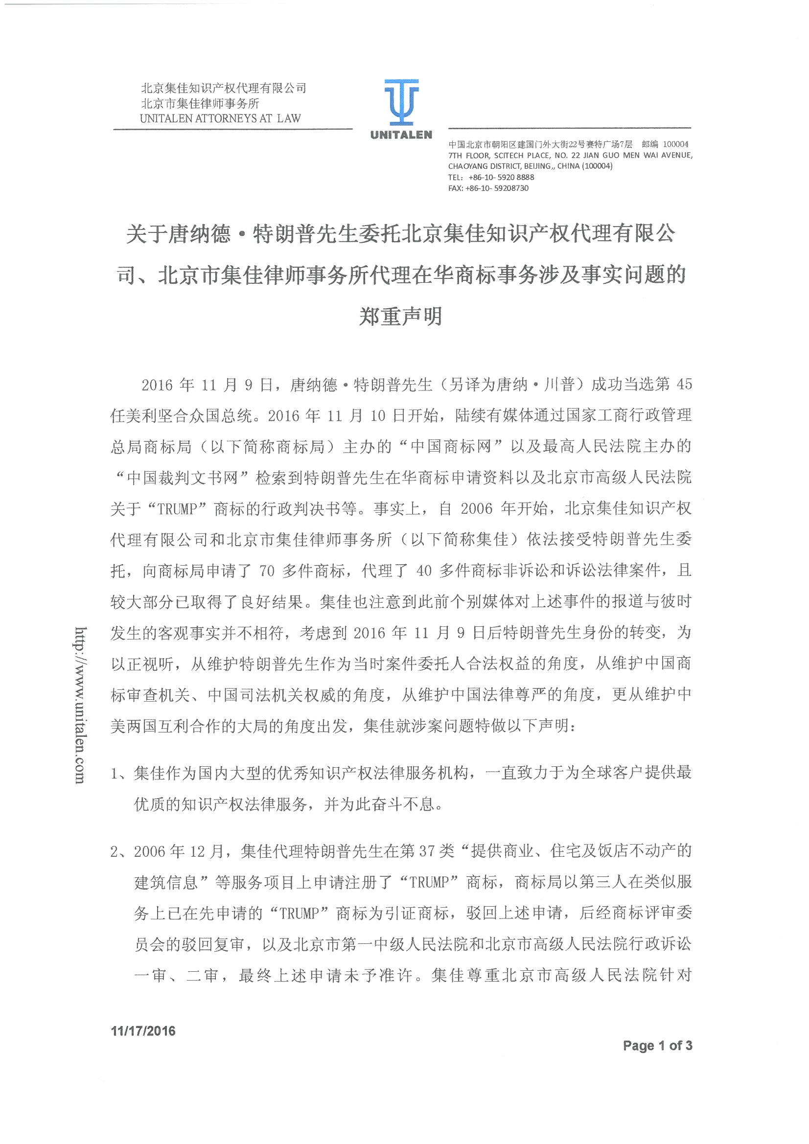 關(guān)于唐納德·特朗普先生委托北京集佳知識產(chǎn)權(quán)代理有限公司、北京市集佳律師事務(wù)所代理在華商標(biāo)事務(wù)涉及事實(shí)問題的鄭重聲明 .pdf