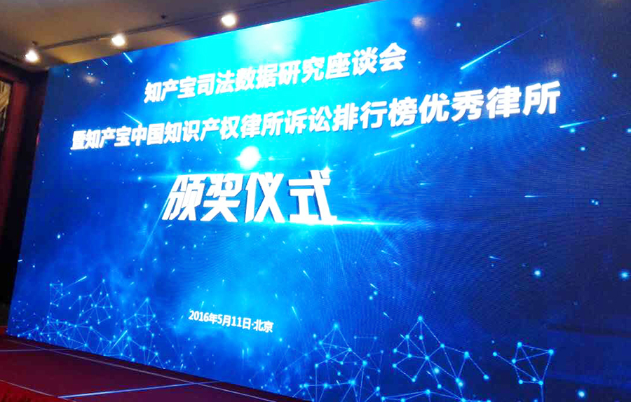 2016年5月11日下午, 知產寶司法數據研究座談會暨知產寶中國知識產權律所訴訟排行榜優秀律所頒獎儀式在京舉行,集佳律所憑借自身的專業實力和卓越的影響力入選行政榜TOP10和綜合榜TOP10。各級司法機關代表、相關國家駐華使館人員及優秀的律所、代理公司代表等五十余人參加了此次頒獎儀式。