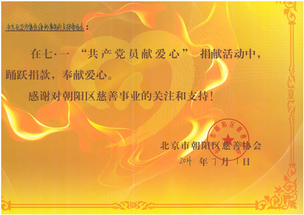 2014年是中國共產(chǎn)黨成立93周年,是全面貫徹黨的十八屆三中全會精神、深入開展黨的群眾路線教育實踐活動的重要一年。為充分發(fā)揮共產(chǎn)黨員的先鋒模范作用,集佳律師事務所積極響應朝陽區(qū)律協(xié)黨委開展“共產(chǎn)黨員獻愛心”捐款活動的號召,面向全所黨員律師、入黨積極分子組織愛心捐獻活動。