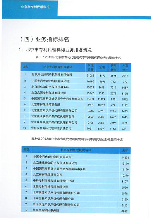 近日,市知識產權局發布2013年度《北京市專利代理年報》,對全市知識產權行業機構情況、人員情況、業務經營情況進行數據統計和評比。集佳繼2012年獲得專利代理總量第一之后,2013年再次以發明、實用新型、外觀設計專利代理總量21082件的成績,在專利代理機構業務排名中蟬聯第一。此外,北京市專利代理人協會還根據相關規定和專家綜合評審,對代理機構進行考核,最終評選出十家優秀專利代理機構,集佳入選。