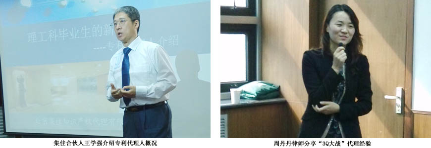 活動(dòng)中,北京市代理人協(xié)會(huì)副會(huì)長(zhǎng)、集佳合伙人王學(xué)強(qiáng)為同學(xué)們介紹了專利代理人的職業(yè)概況,使大家對(duì)知識(shí)產(chǎn)權(quán)和專利代理人行業(yè)有了更客觀的了解。知名代理律師周丹丹則與大家分享了“3Q大戰(zhàn)”的代理經(jīng)驗(yàn),充分展現(xiàn)了律師的代理風(fēng)采。宣講過程中,大家圍繞專利代理人的職業(yè)規(guī)劃和發(fā)展前景、律師在代理案件過程中總結(jié)的難點(diǎn)、解決方法和思路等問題與兩位專業(yè)人士進(jìn)行了熱烈討論。