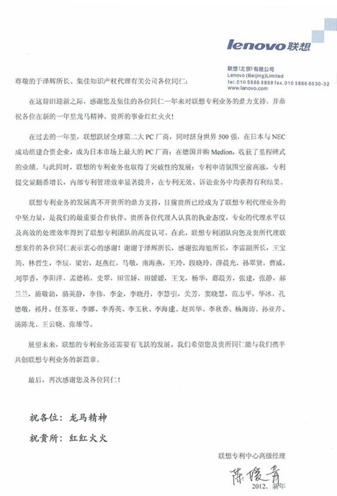 在新年即將到來之際,集佳收到聯(lián)想公司專利中心發(fā)來的新年感謝信,對集佳在專利工作上給予的大力支持表示感謝。在此,也感謝廣大客戶一直以來對集佳工作的信任與支持,今后我們將為企業(yè)提供更加專業(yè)和優(yōu)質(zhì)的知識產(chǎn)權(quán)服務(wù)。