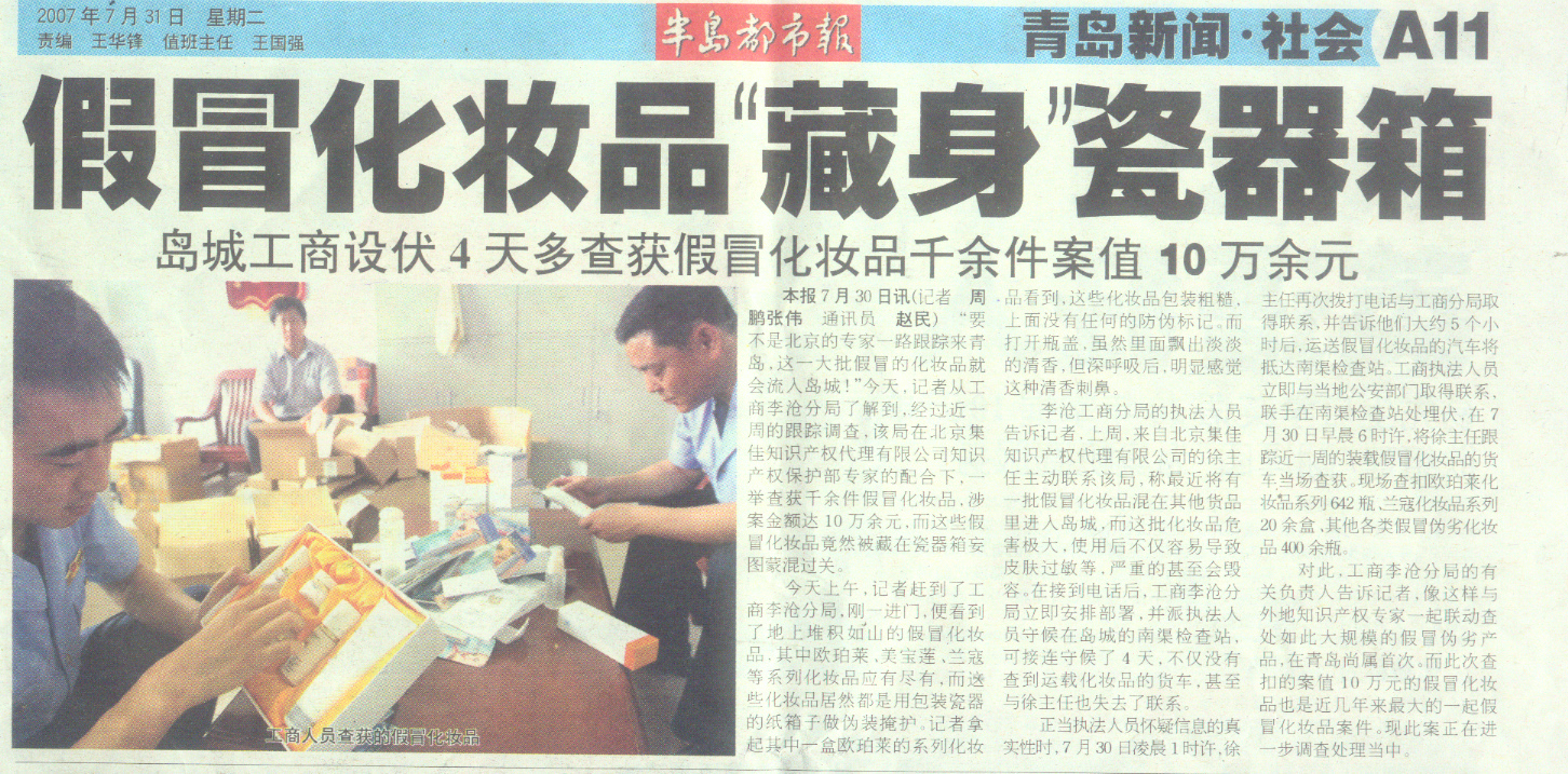青島市李滄工商分局的執(zhí)法人員稱(chēng),案發(fā)的前一周,來(lái)自北京集佳知識(shí)產(chǎn)權(quán)代理有限公司的保護(hù)部主任主動(dòng)聯(lián)系到他們,稱(chēng)近期將有一批假冒化妝品混在其他貨品里進(jìn)入青島,而這批化妝品危害極大,使用后不僅容易導(dǎo)致皮膚過(guò)敏等,嚴(yán)重的甚至?xí)荨T诮拥诫娫捄螅鄭u市工商李滄分局立即安排部署,并派執(zhí)法人員守候在島城的南渠檢查站,可接連守候了4天,不僅沒(méi)有查到運(yùn)載化妝品的貨車(chē),甚至與集佳也失去了聯(lián)系。