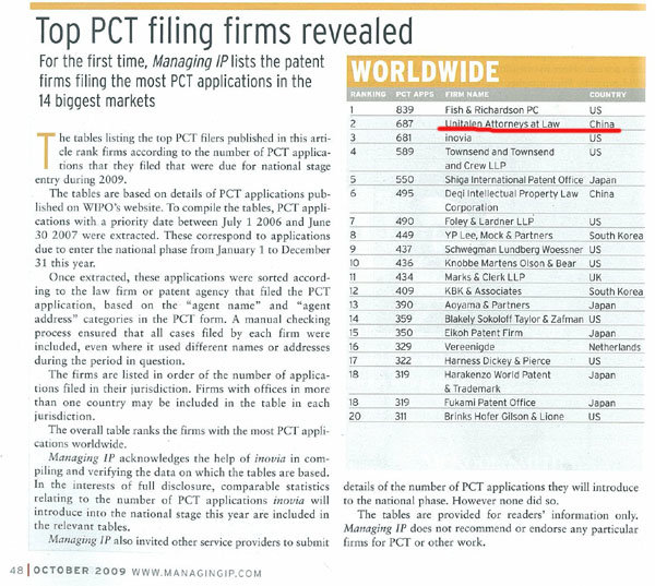 根據(jù)全球權(quán)威知識產(chǎn)權(quán)刊物Managing Intellectual Property (MIP)2009年10月期公布的一份數(shù)據(jù)顯示,全球PCT申請統(tǒng)計中,在申請日(優(yōu)先權(quán)日)介于2006年7月1日至2007年6月30日之間,30個月的絕限落在2009年1月至2009年12月間的已經(jīng)公開的PCT申請中,集佳知識產(chǎn)權(quán)代理有限公司以687件申請在全球代理機構(gòu)排名中僅次于一家美國事務(wù)所而位列第二,也是中國唯一一家躋身全球前五名的知識產(chǎn)權(quán)服務(wù)機構(gòu)。