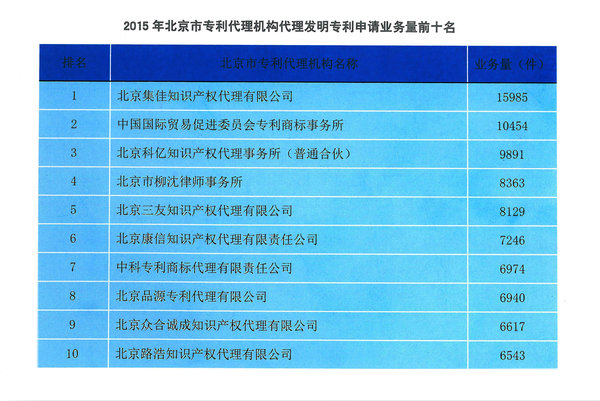 北京市知識產(chǎn)權(quán)局發(fā)布《2015年度北京市專利代理年報》,在北京專利代理機構(gòu)業(yè)務(wù)排名中,集佳以代理量15985件的成績在發(fā)明專利申請量中再次排名第一,并在專利申請業(yè)務(wù)總量中排名第二。此外,經(jīng)過專家評審,集佳憑借綜合的業(yè)務(wù)能力和優(yōu)質(zhì)的專業(yè)服務(wù),連續(xù)三年入選“北京市優(yōu)秀專利代理機構(gòu)”。