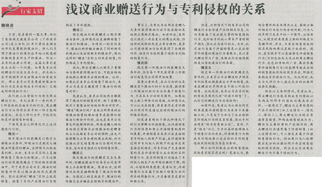 集佳代理人撰文《淺議商業(yè)贈送行為與專利侵權的關系》在《中國知識產(chǎn)權報》發(fā)表