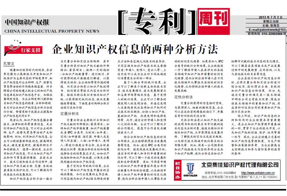 《中國知識產權報》:企業知識產權信息的兩種分析方法