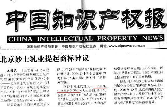 《中國知識(shí)產(chǎn)權(quán)報(bào)》北京妙士乳業(yè)提起商標(biāo)異議