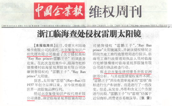 《中國企業(yè)報(bào)》:浙江臨海查處侵權(quán)雷朋太陽鏡