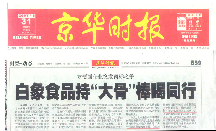 集佳就方便面行業“大骨”商標之爭接受《京華時報》的采訪