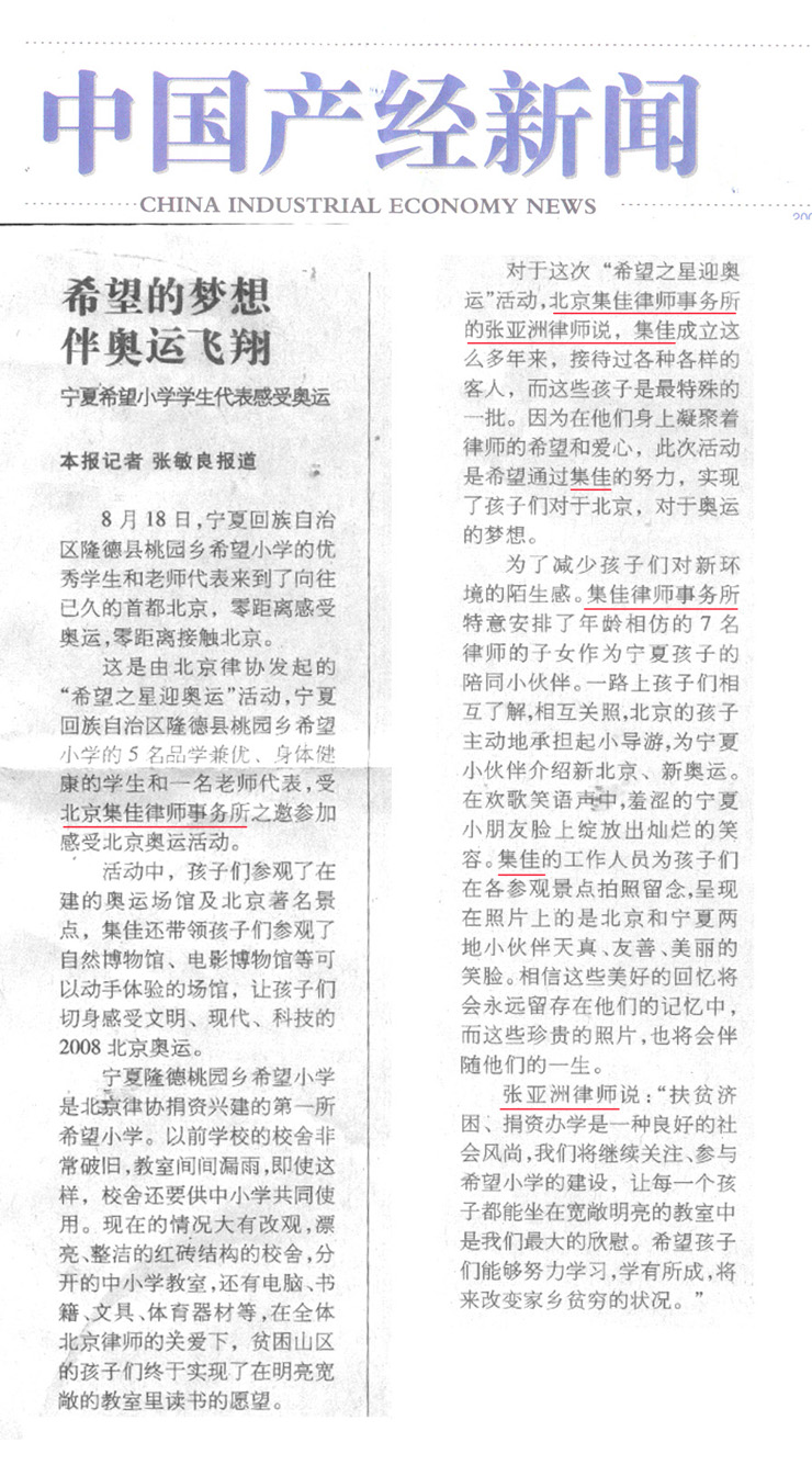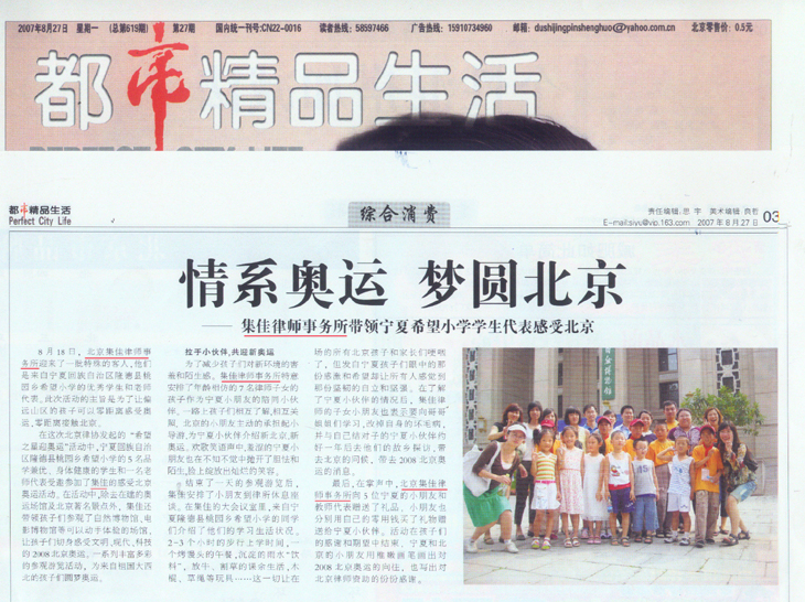 《中國產經新聞》、《都市精品生活》:集佳律師事務所帶領寧夏希望小學學生代表感受北京