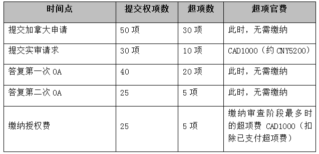 自2022年10月3日之后,申請人在提出實(shí)審請求時應(yīng)支付超項(xiàng)官費(fèi),超出20項(xiàng)權(quán)項(xiàng)每項(xiàng)收取附加費(fèi)CAD100。