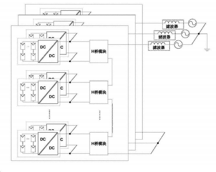 1、一種中高壓光伏發(fā)電系統(tǒng),其特征在于,包括三相濾波器和三個(gè)分別通過(guò)所述三相濾波器以星形或三角形接法實(shí)現(xiàn)連接的相電路,所述相電路中包括一個(gè)或者兩個(gè)串聯(lián)的橋臂,所述橋臂包括:至少一個(gè)級(jí)聯(lián)模塊、至少一個(gè)光伏組串和至少一個(gè)絕緣子,所述光伏組串包括多個(gè)光伏組件;所述橋臂中:
