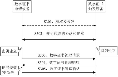 數(shù)字證書頒發(fā)設(shè)備接收所述數(shù)字證書管理請(qǐng)求消息,利用所述安全數(shù)據(jù)通道向數(shù)字證書申請(qǐng)?jiān)O(shè)備發(fā)送數(shù)字證書管理響應(yīng)消息,所述數(shù)字證書申請(qǐng)?jiān)O(shè)備利用所述安全數(shù)據(jù)通道接收所述數(shù)字證書管理響應(yīng)消息,所述數(shù)字證書管理響應(yīng)消息經(jīng)所述數(shù)據(jù)通信密鑰加密處理;