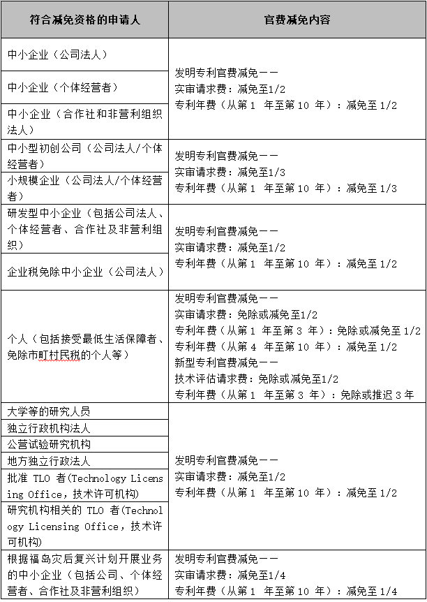 對于在2019年4月1日之后提出實審請求的日本發明專利申請,其實審請求費和專利年費將按照下表內容進行減免: