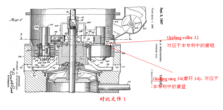 上述對(duì)比文件(雷蒙機(jī))的附圖中,其磨輥和磨盤(pán)兩者磨面的外輪廓線與地面垂直,且二者的軸心線平行。因此,磨輥與磨盤(pán)的相對(duì)位置關(guān)系僅為簡(jiǎn)單的內(nèi)外關(guān)系(完全內(nèi)側(cè)),也即是二者磨面的外輪廓線與軸心線均與地面垂直,并不存在上下關(guān)系。然而,在本專利的主要實(shí)施例中,磨輥與磨盤(pán)之間存在著上下關(guān)系,呈斜上方布置,參見(jiàn)下述該專利的附圖1: