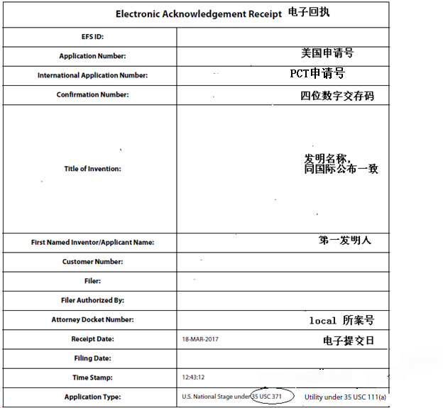應(yīng)核查電子回執(zhí)中的基本信息,并通過核查電子回執(zhí)中的信息來(lái)判斷申請(qǐng)類型是否正確。以下是對(duì)電子回執(zhí)的摘錄說(shuō)明,供參考。從該摘錄說(shuō)明中可看出,當(dāng)Application Type顯示為 U.S.National stage under 35 U.S.C. 371時(shí),則說(shuō)明該美國(guó)申請(qǐng)是PCT進(jìn)入美國(guó)國(guó)家階段的申請(qǐng);當(dāng)Application Type顯示為 Utility under 35 U.S.C. 111(a)時(shí),則說(shuō)明該美國(guó)申請(qǐng)是PCT進(jìn)入美國(guó)國(guó)家的申請(qǐng)(就整體而言,也可能是巴黎公約申請(qǐng),但本節(jié)主要針對(duì)PCT進(jìn)入美國(guó)介紹)。