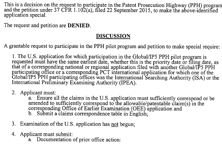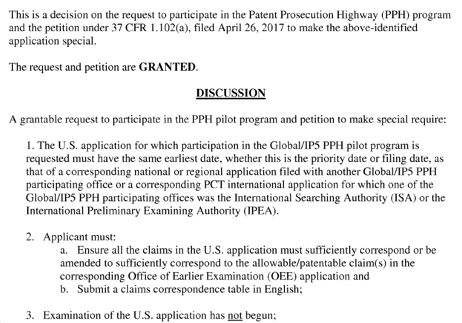 專利審查高速公路(簡(jiǎn)稱PPH)是在美國(guó)專利申請(qǐng)中常用的加快審查途徑。USPTO是在后申請(qǐng)的審查局,且作為在先申請(qǐng)的審查局經(jīng)過審查程序認(rèn)為受理的對(duì)應(yīng)申請(qǐng)包含至少一項(xiàng)可被授權(quán)或具有可專利性的權(quán)利要求,那么申請(qǐng)人可以向USPTO 請(qǐng)求參與PPH 項(xiàng)目。