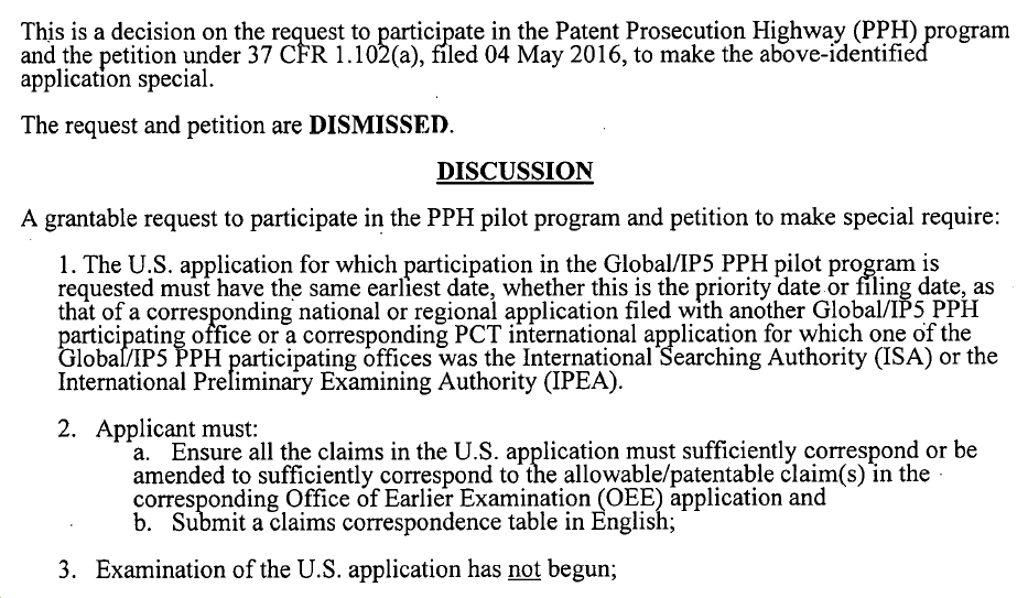 c)PPH拒絕通知(摘錄示例如下圖): 該通知是告知類通知。告知申請(qǐng)人PPH請(qǐng)求被拒絕。 該通知通常是因PPH請(qǐng)求未滿足時(shí)機(jī)要求(即審查員已開始審查)而產(chǎn)生。