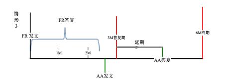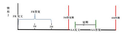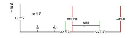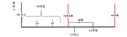 (1)情形1、申請(qǐng)人于FR發(fā)文日起的2個(gè)月內(nèi)完成答復(fù),審查員在3個(gè)月答復(fù)期內(nèi)發(fā)出AA,若AA答復(fù)日晚于3M法定期限,則延期自3M法定期限起算。