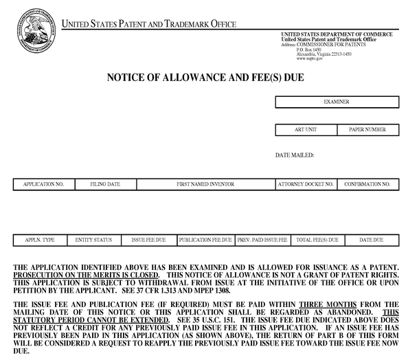 美國(guó)專利申請(qǐng)中,授權(quán)費(fèi)的繳納期限為3個(gè)月。該期限不能延展。