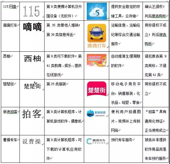 原則上,判斷當事人通過APP所提供的服務性質,應該“結合應用軟件具體提供服務的目的、內容、方式、對象等方面綜合進行確定”,但具體到個案,法院很難、也沒有必要對服務性質做出認定。在“滴滴打車”一案中,被告主張其服務是“第39類運輸類服務,包括為客戶提供運輸信息和運輸經紀服務”,法院對此并未評判,而是從被告服務的具體特點和《分類表》對注冊商標核定服務的界定兩個方面進行比對后,認定被告服務與第35類、第38類服務不類似;在“楚楚街”一案中,被告主張“楚楚街”電商平臺屬于第35類“替他人推銷”服務,法院認為其屬于“推銷商品、促成交易的服務”,與25類服裝商品不相同、不類似,但沒有具體界定服務類別;在“115網盤”一案中,判決表述當事人雙方均同意,被告服務屬于第42類“提供互聯網搜索引擎、計算機軟件的維護、安裝、設計、編程、更新、咨詢,把有形的數據和文件轉換成電子媒體、替他人創建和維護網站、計算機程序和數據的數據轉換【非有形轉換】”服務,但法院并未主動進行認定。