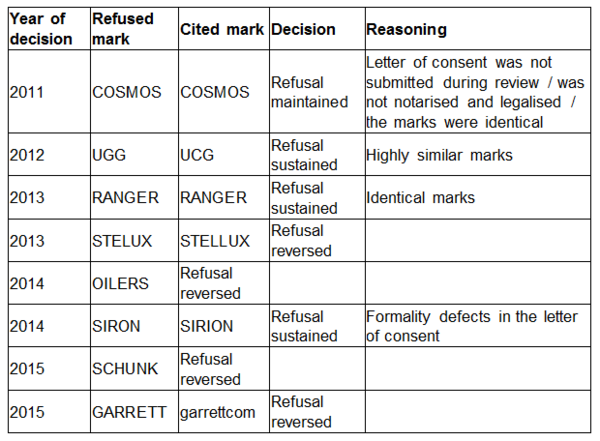 Based on this – as well as the aforementioned draft regulations – it is clear that letters of consent have become a strong type of evidence when it comes to overcoming *ex officio* refusals, provided that the two marks are not identical.