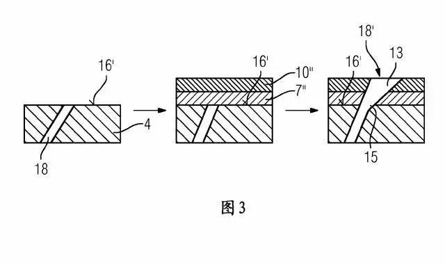 而本申請涉及的是一種重新制造具有擴散器的貫通孔的方法,其用于新構(gòu)件。從圖3可知,首先在襯底4中加工出貫通孔18,此時在襯底4中并不具有擴散器部分15;然后進行覆層;最后制造擴散器13,即首次為所述擴散器13移除所述襯底4的擴散器部分15中的附加的材料。也就是說,在覆層前在襯底4中并不具有擴散器部分15。