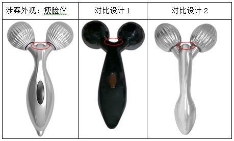 請求人主張,將證據1組合證據2的兩個按摩球中間的凸出部位,涉案專利與上述證據的組合相比不具有明顯區別。焦點問題在于,盡管證據2的兩個按摩球中間具有明顯可見的凸出部分,且形狀與證據1的按摩球中間外凸形狀一致,但是否可以作為設計特征與對比設計1進行組合。