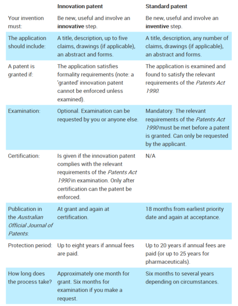 澳大利亞專利分為:標準專利Standard patent(類似中國的發明)、創新專利innovation patent(類似中國的實用新型,但也有較多不同之處)、外觀專利。