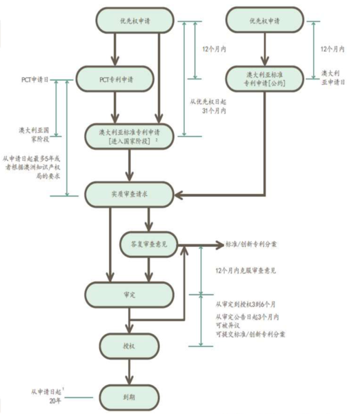 標準專利:可以通過PCT/CP提交澳大利亞標準專利新申請,并在5年內提出實質審查(PCT從PCT國際申請日起算,CP從澳大利亞申請日起算)。在收到第一次審查意見后12個月內克服所有缺陷,克服缺陷后進入審定,審定后3-6個月授權。標準專利保護期限是20年(藥物、藥品專利保護期限為25年)。