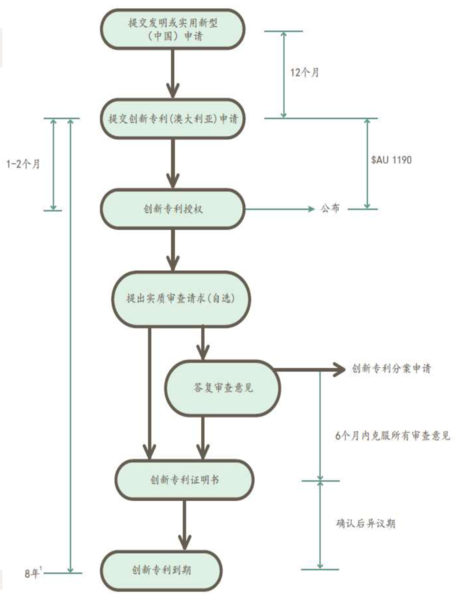 創新專利:可以通過CP提交澳大利亞標準專利新申請;如果是通過PCT途徑的話,不能直接提交創新專利,而是需要以PCT申請為基礎提交分案申請進入澳大利亞;或者以標準專利進入國家階段,然后再通過轉換類型或者提分案得到創新專利申請。實審不是必須的,如果提了實審,那么在收到第一次審查意見后6個月內需克服所有缺陷,克服缺陷后進入審定,審定后3-6個月授權。創新專利保護期限是8年。