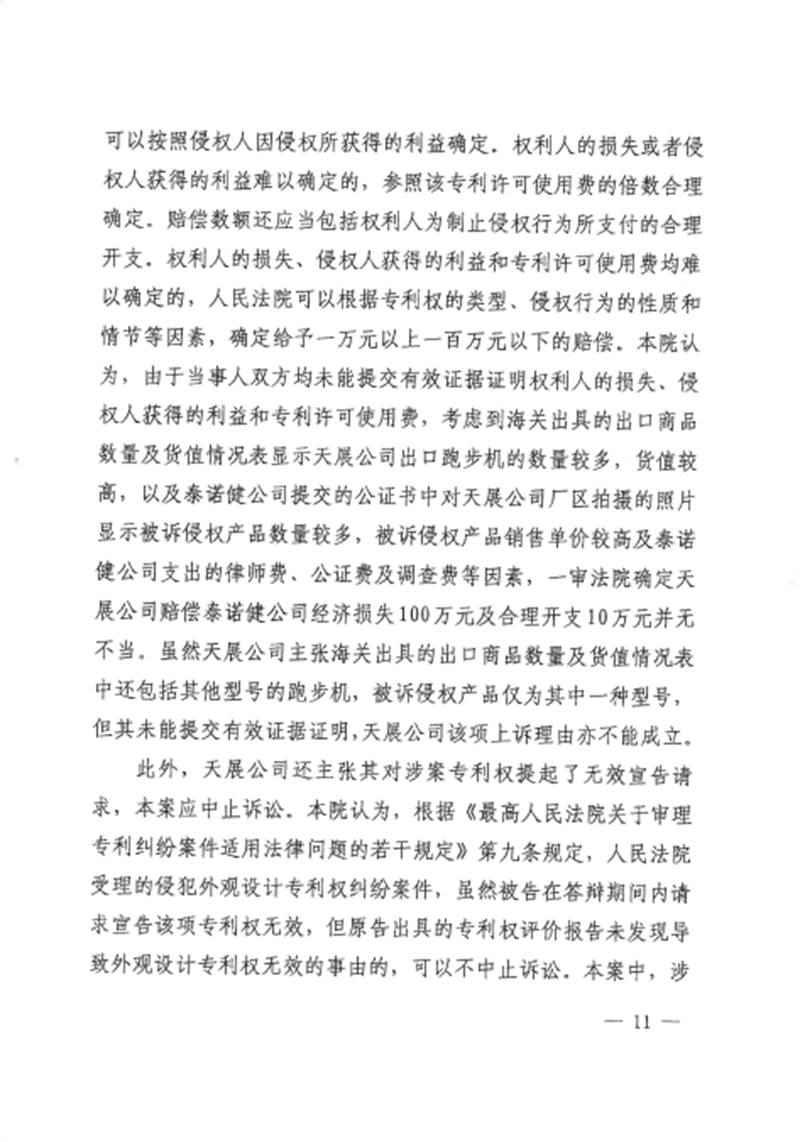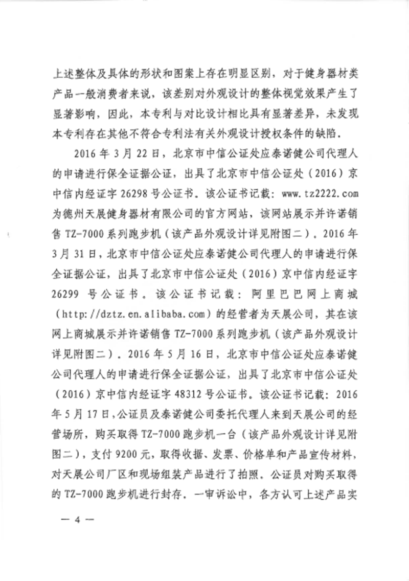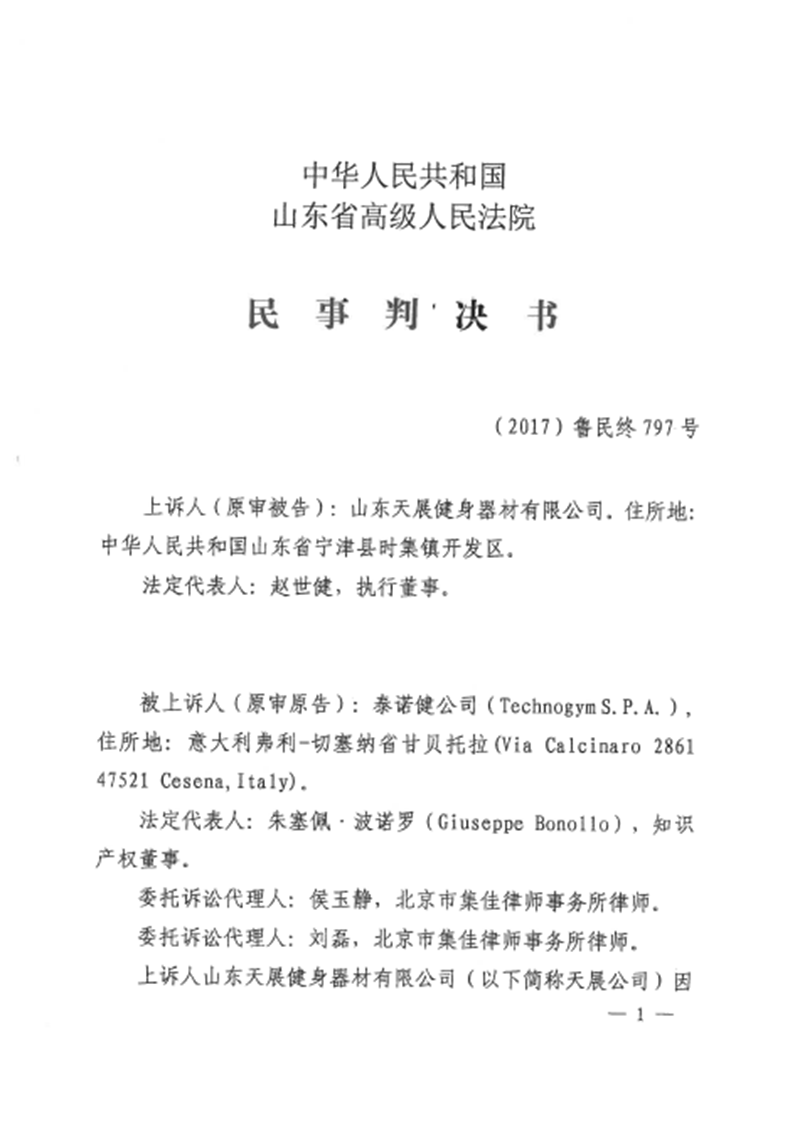 集佳代理意大利泰諾健公司訴山東天展健身器材有限公司(以下簡稱“天展公司”)侵害外觀設計專利權糾紛一案,經濟南中院一審((2016)魯民初1656號)、山東高院二審((2017)魯民終797號),我們已于近日收到由山東高院做出的終審判決。山東高院駁回被告上訴,維持一審判決,認定被告天展公司生產、銷售、許諾銷售的被控侵權跑步機產品落入涉案專利權保護范圍,并支持了原告泰諾健公司主張的停止侵權行為、賠償經濟損失及合理維權費用等請求。