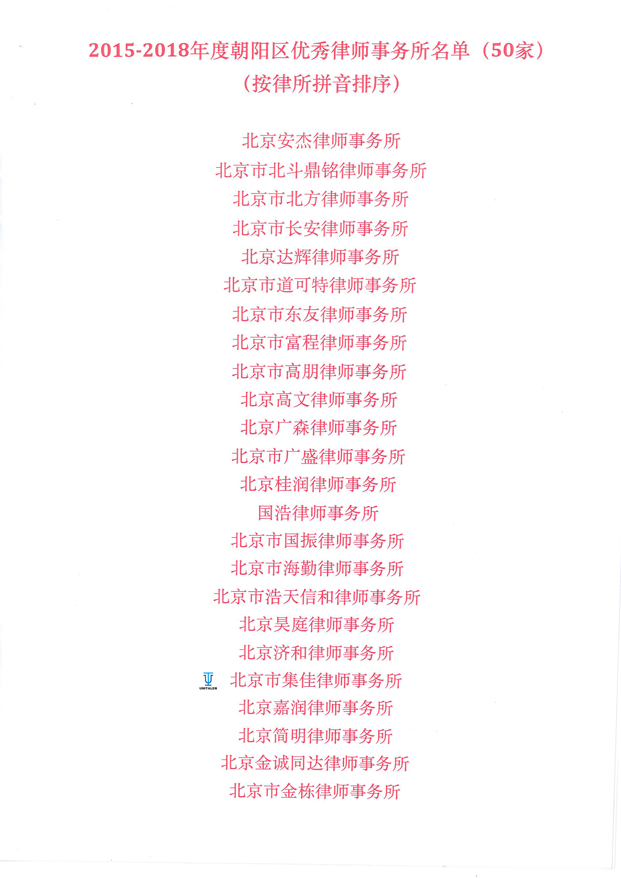 日前,朝陽區(qū)律師協(xié)會公布了2015-2018年度朝陽區(qū)優(yōu)秀律師事務所和優(yōu)秀律師的名單,集佳律所和集佳律師均位列其中。