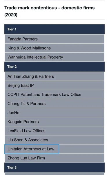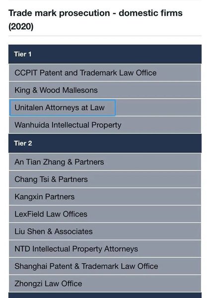 近日,全球領(lǐng)先的權(quán)威知識產(chǎn)權(quán)媒體《知識產(chǎn)權(quán)管理》(Managing Intellectual Property,MIP)公布了2020年商標(biāo)業(yè)務(wù)的知識產(chǎn)權(quán)之星排行榜,集佳再次蟬聯(lián)商標(biāo)申請及確權(quán)領(lǐng)域(Trademark Prosecution)排行榜第一梯隊,并榮登商標(biāo)保護及訴訟領(lǐng)域(Trademark Contentious)排行榜第二梯隊。