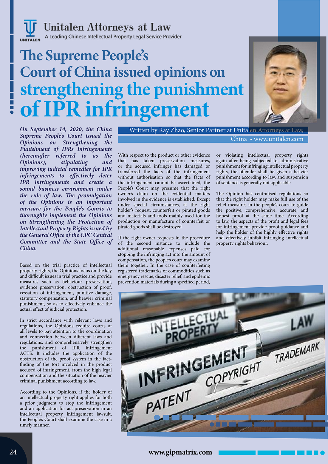 集佳文章《The Supreme People’s Court of China issued opinions on strengthening the punishment of IPR infringement》在《The Global Ip》發表