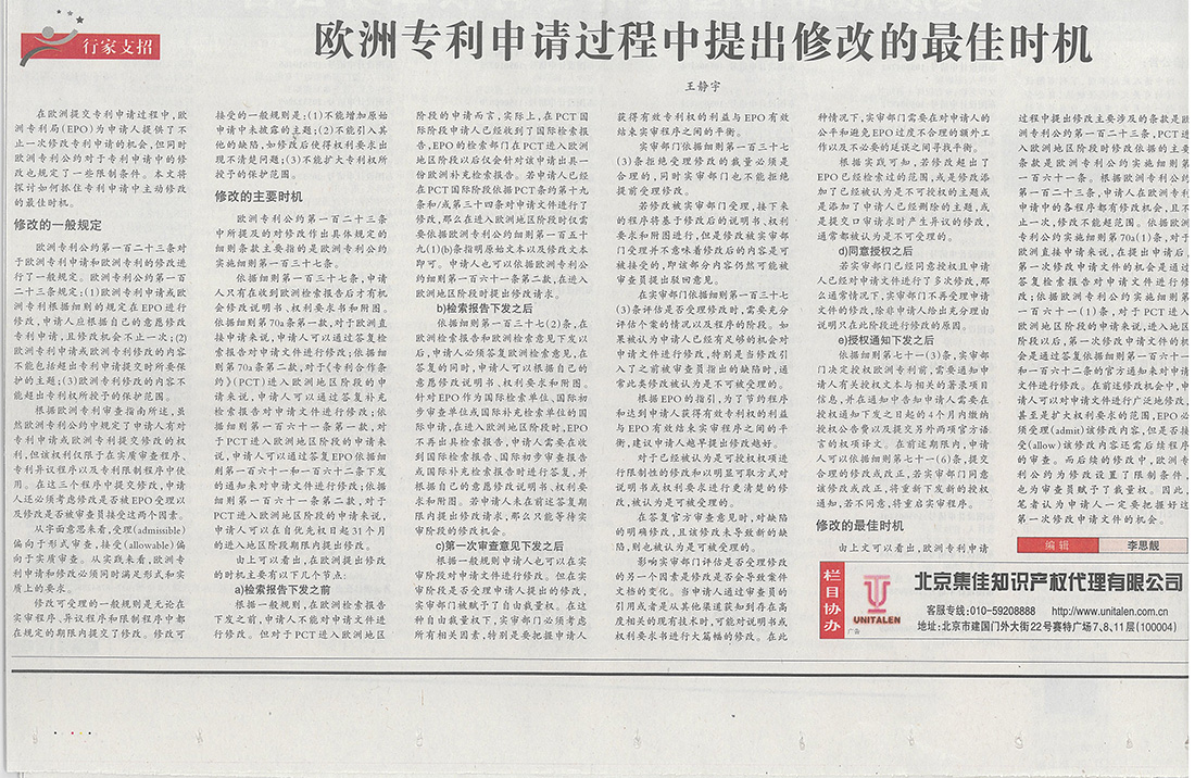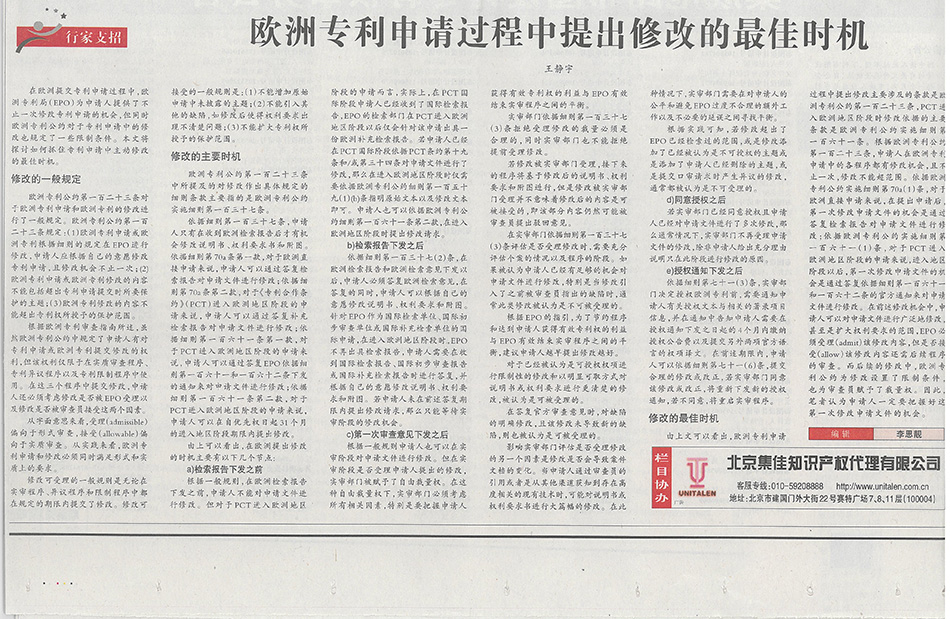 集佳文章《歐洲專利申請過程中提出修改的最佳時機》在《中國知識產權報》發表