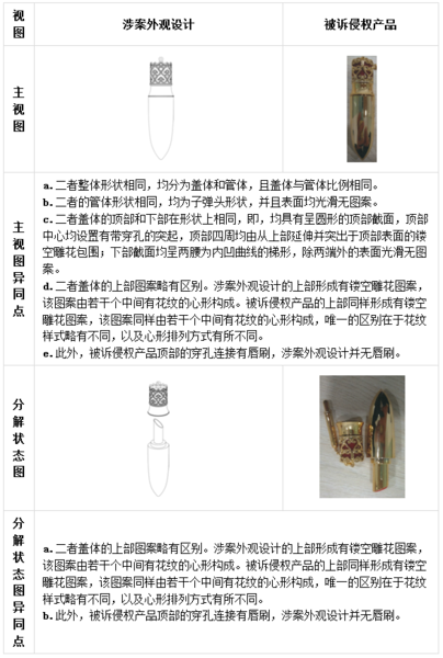 3、經(jīng)過比對,被訴侵權(quán)產(chǎn)品設(shè)計與涉案專利的確存在以下兩點區(qū)別,即:(1)蓋體上鏤空雕花的具體圖案略有不同;(2)頂部穿孔處是否連接有唇刷。