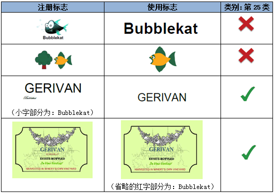 若注冊(cè)標(biāo)識(shí)本身具有中等強(qiáng)度的顯著性,在此基礎(chǔ)上省略的為非顯著要素或弱顯著要素,則一般視為注冊(cè)標(biāo)識(shí)的使用。但若省略的部分為主要視覺(jué)部分,或與注冊(cè)標(biāo)志中其他元素有相互作用的關(guān)聯(lián)關(guān)系,則其省略可能會(huì)造成顯著部分的實(shí)質(zhì)變更。如: