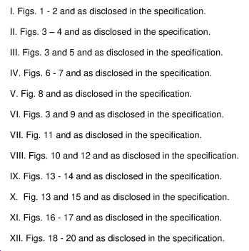 通過列出的權(quán)利要求與附圖的對應(yīng)關(guān)系表格,即可以清楚地確定不同的子類對應(yīng)的權(quán)利要求。例如,申請人選擇了 Species XII,其對應(yīng)權(quán)利要求有1,2,3,5…。在這種情況下,建議選擇的同時(shí)一并進(jìn)行反駁,從而在所選擇的權(quán)利要求授權(quán)之后,也可以重新加入其他未選擇的無沖突的權(quán)利要求。