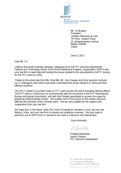 Recently, Philippe Baechtold, Senior Director of the PCT Services Department of the International Bureau of the World Intellectual Property Organization (WIPO) sent a letter of thanks to Yu Zehui, President of Unitalen and Chairman of the partners meeting of Unitalen, expressing sincere gratitude to Unitalen staff who assisted the PCT Services Department to perfectly solve the issues related to the unavailability of WIPO ePCT system in China.