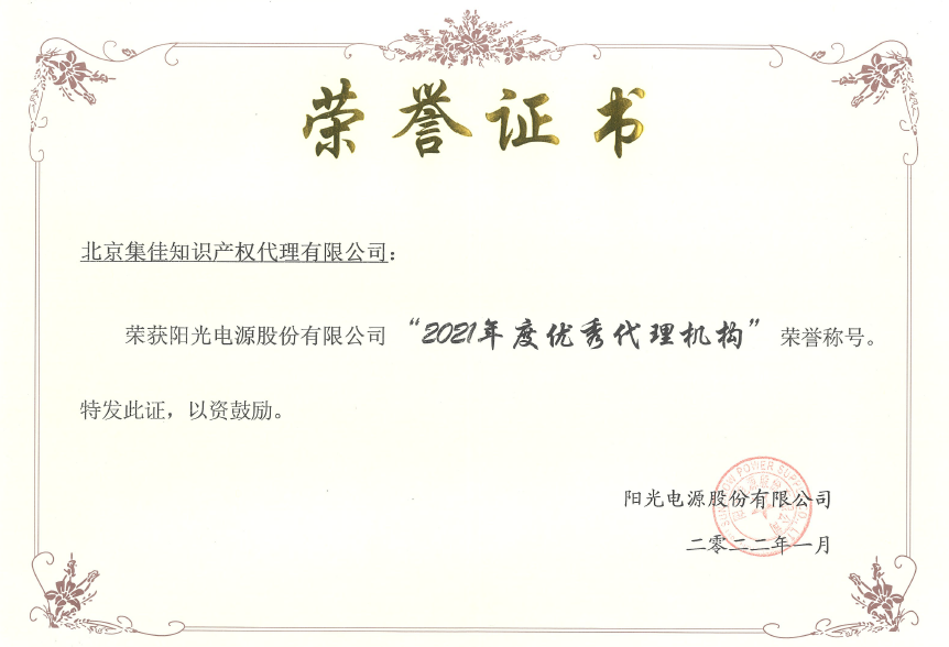新春伊始,集佳服務再次喜獲客戶點贊——陽光電源股份有限公司授予集佳“2021年度優秀代理機構”榮譽稱號,并授予集佳專利代理師安淼胡素莉“2021年度金牌代理師”稱號,陳穎“2021年度新星代理師”稱號。