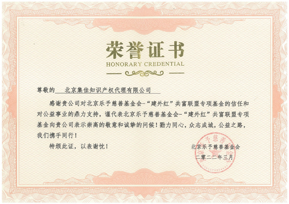 近日,集佳收到北京樂予慈善基金會頒發(fā)的榮譽證書,感謝集佳鼎力支持“建外紅”共富聯(lián)盟慈善公益項目,積極捐贈善款,參與幫扶活動。