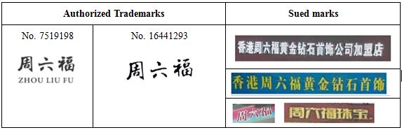 The two defendants in the original trial (Zhongbai Jewelry Store and Chendai Town Zhou Liu Fu Jewelry Store) used the above sued marks on the background walls, store signs, jewelry counters, jewelry boxes, billboards, packaging bags, quality assurance certificates and other places in their stores and made the following defense: firstly, this was a reasonable use of the franchisor's business name rather than trademark; secondly, the franchisor enjoyed the right of prior use. The first instance judgment determined that "圖片"(Zhou Liu Fu), ""(Zhou Liu Fu Jewelry) and other sued infringing marks which prominently used "周六福"(Zhou Liu Fu) constituted trademark infringement, while the mark "香港周六福黃金鉆石首飾公司加盟店"(Hong Kong Zhou Liu Fu Gold Diamond Jewelry Company Franchised Store) that did not prominently use "周六福"(Zhou Liu Fu) constituted unfair competition. The two defendants in the original trial appealed, and the second instance judgment revoked the determination of unfair competition in the first instance judgment, on the grounds that the two defendants lacked subjective bad faith, and that no evidence proved that their marks were "confusing and misleading enough to the relevant public", and thus did not constitute unfair competition. After the retrial request made by Zhou Liu Fu Jewelry Co., Ltd. ("Zhou Liu Fu Jewelry"), Fujian Provincial Higher People's Court determined as follows in the (2021) Min Min Zai No. 250 and (2021) Min Min Zai No. 253 civil judgments: (1) the trademarks "圖片" and "圖片"(Zhou Liu Fu) have possessed relatively high reputation and the two defendants in the original trial, as peer competitors, should reasonably avoid these trademarks; (2) "周六福"(Zhou Liu Fu) is the most recognizable and distinctive part in the sued infringing mark "圖片". The trade name of this Hong Kong company is exactly the same with the word part in the registered trademark of the right owner. In the case that the business scopes of both parties overlap, such using manner is sufficient to cause confusion and misunderstanding and thus constitutes unfair competition; (3) the two defendants in the original trial have no right to defend by using a subsequently obtained business authorization to claim for prior use; (4) the copyright registration date provided by the two defendants in the original trial as evidence is later than the application date of the right owner's registered trademark, which cannot prove the prior copyright; and (5) according to the judicial spirit of the Supreme Court, if enterprises registered abroad carry out business activities in the mainland, they must abide by the domestic laws and reasonably avoid the prior rights that have been protected by the domestic laws when using business marks such as the foreign name of enterprises. Therefore, the two defendants in the original trial cannot be exempted from infringement liability, but after assuming the infringement liability, they can claim rights from the franchisor based on the contract.
