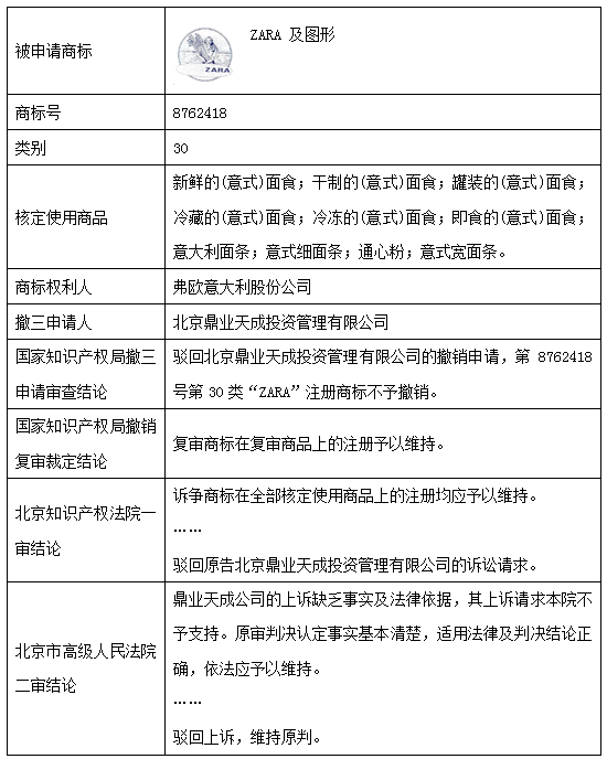 2019年01月15日,北京鼎業(yè)天成投資管理有限公司向國家知識(shí)產(chǎn)權(quán)局商標(biāo)局提交撤銷三年不使用申請(qǐng),申請(qǐng)撤銷弗歐意大利股份公司名下第8762418“ZARA及圖形”商標(biāo)在第30類“新鮮的(意式)面食”等全部核定使用商品上的注冊(cè)。弗歐意大利股份公司在收到商標(biāo)局下發(fā)的提供使用證據(jù)通知后,于規(guī)定期限內(nèi)提交了答辯理由及被申請(qǐng)商標(biāo)在指定期限內(nèi)(即2016年01月15日至2019年01月14日)的使用證據(jù)。2019年08月27日,商標(biāo)局經(jīng)審查,裁定被申請(qǐng)商標(biāo)不予撤銷。