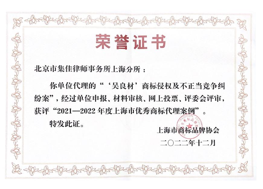 Unitalen Shanghai Branch was awarded the "Outstanding Trademark Agency Case in Shanghai from 2021-2022" for its outstanding work over the "吳良材(Wu Liangcai)" trademark infringement and unfair competition case. Additionally, Unitalen Shanghai Branch was awarded the "Overseas Trademark Protection Nomination Award in Shanghai in 2022".