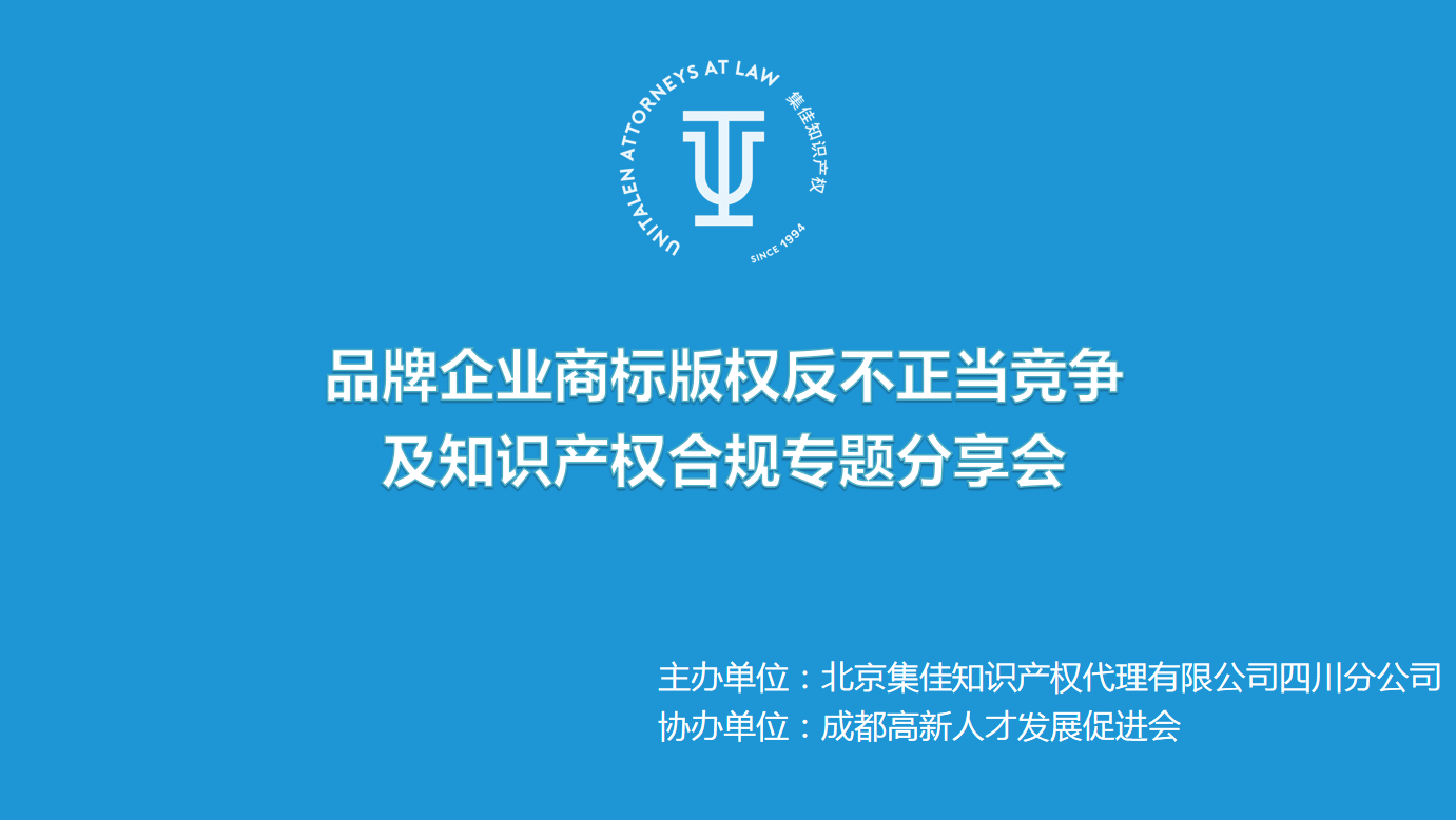 5月26日,由北京集佳知識產(chǎn)權(quán)代理有限公司四川分公司主辦、成都高新人才發(fā)展促進(jìn)會協(xié)辦的“品牌企業(yè)商標(biāo)版權(quán)反不正當(dāng)競爭及知識產(chǎn)權(quán)合規(guī)”專題分享會在世紀(jì)城新會展中心順利舉辦。