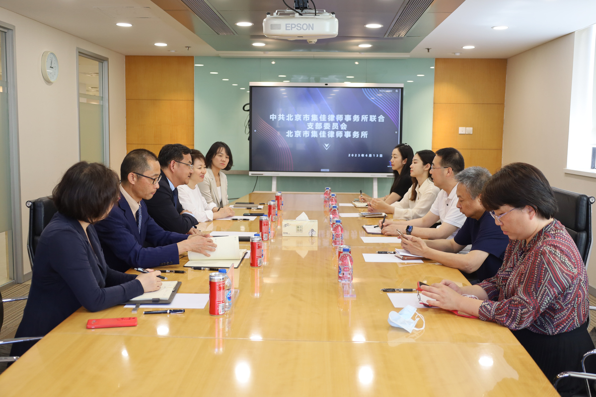 6月13日,北京市朝陽區司法局黨組書記、局長倪東新,朝陽區司法局副局長、區律師行業黨委書記曹宏,朝陽區律師協會秘書長劉素紅,朝陽區司法局辦公室主任王鉑涵,朝陽區司法局行政審批科科長王楠一行到訪集佳律所調研指導。集佳律所主任、高級合伙人李永波律師,財務總監張海芳女士,高級合伙人張亞洲律師,合伙人侯玉靜律師,合伙人周丹丹律師參加了會議并作工作匯報。