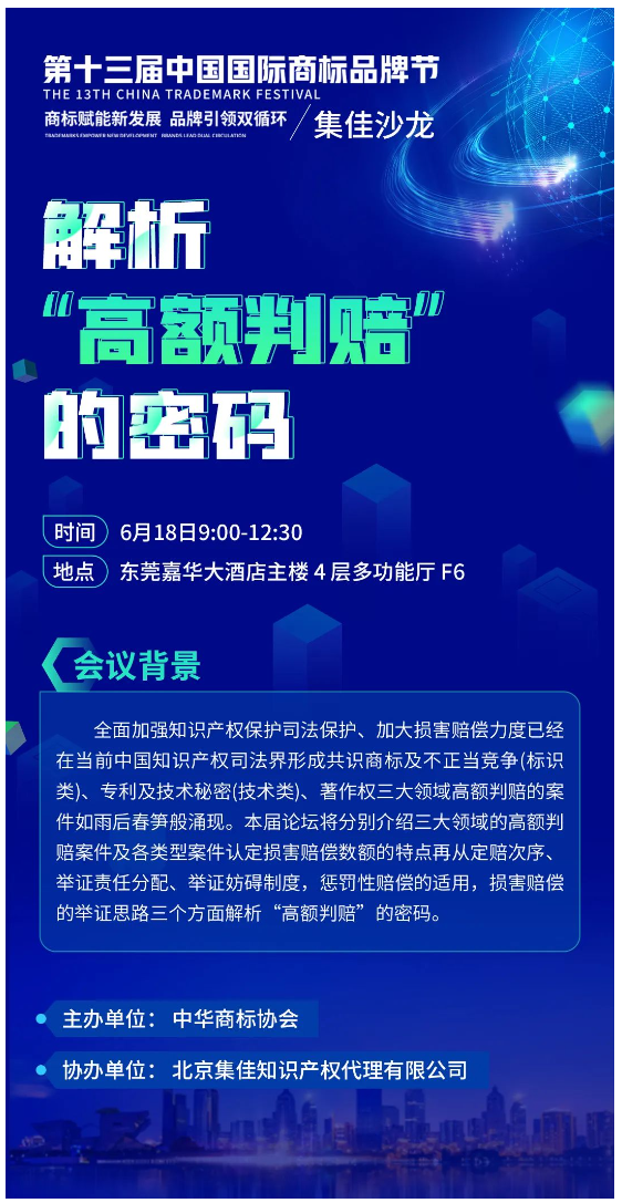 6月18日,集佳沙龍將在東莞嘉華大酒店主樓4層多功能廳F6舉辦,邀請(qǐng)資深法官、律師等眾多知名專家,共同解析知識(shí)產(chǎn)權(quán)案件“高額判賠”的密碼,屆時(shí)期待您的光臨!
