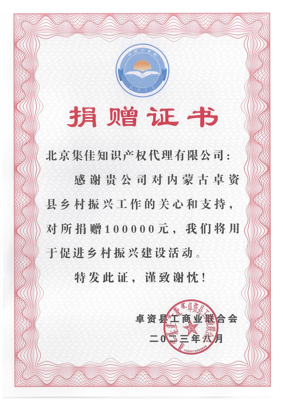 作為民營企業標桿,集佳始終不忘初心,自覺承擔各項社會責任,用實際行動踐行企業擔當。在助力鄉村振興、共同富裕的道路上,多年來,集佳積極響應國家政策,持續貢獻企業力量,累計捐款530余萬元參與了河北崇禮、湖南桑植、廣西馬山、內蒙科左后旗和卓資縣等地的幫扶建設,并取得了良好成效。未來,集佳將開展更多公益活動,并積極依托專業優勢,發揮知識產權力量更好地助力鄉村振興建設,通過專業的知識產權服務回饋國家和社會。